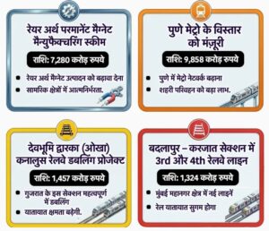 इन फैसलों में आत्मनिर्भर भारत की ओर कदम बढ़ाते हुए एक महत्वपूर्ण विनिर्माण योजना के साथ-साथ महाराष्ट्र और गुजरात में शहरी परिवहन और रेल कनेक्टिविटी को मजबूत करने के प्रोजेक्ट शामिल हैं।